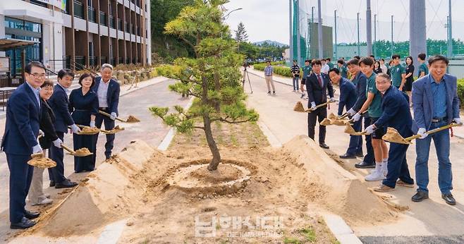 | ▲ 내빈들이 보물섬남해FC 클럽하우스 준공 기념 식수에 참여하고 있다. |