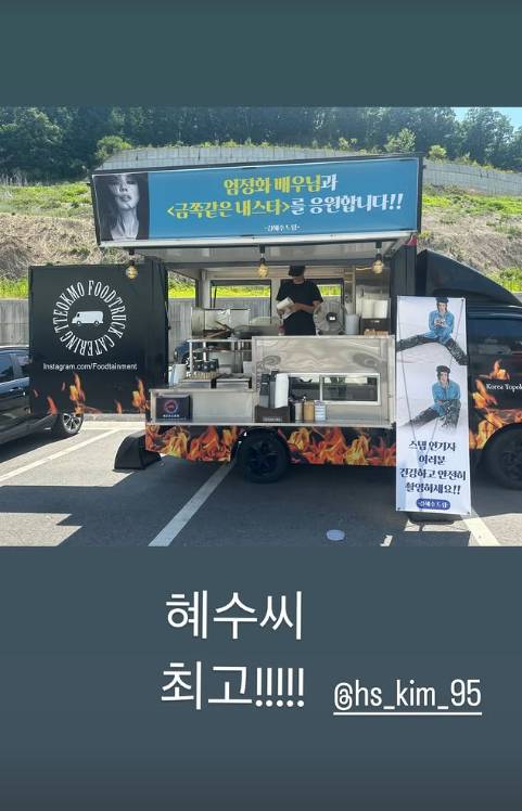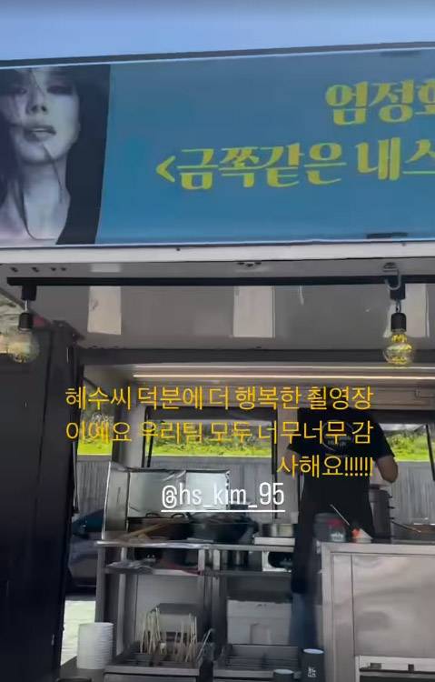 엄정화는 12일 자신의 SNS를 통해 드라마 '금쪽같은 내스타' 촬영 현장에 도착한 간식차 인증 사진과 영상을 공개하며 김혜수를 향한 고마운 마음을 전했다.