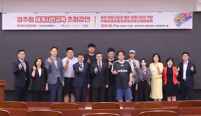 동국대 WISE캠퍼스는 지난 10일 동국대 WISE캠퍼스 원효관 글로벌에이스홀에서 경주시 후원으로 천르바오 주부산 중국총영사를 초청해 초청해 “경주형 세계시민교육 초청강연”을 개최했다.