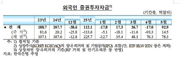 한국은행이 오늘(13일) 발표한 '국제금융·외환시장 동향'에 따르면 5월 중 외국인 증권(주식·채권) 투자자금은 92억 9천만 달러 순유입됐습니다.