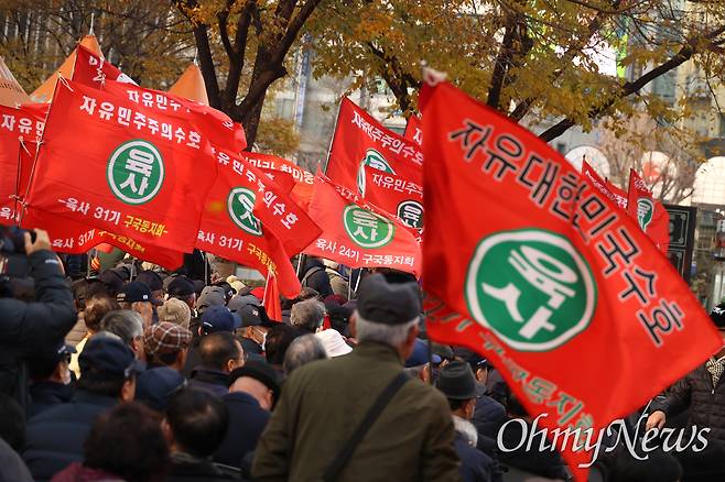 | ▲ 지난 2023년 11월 23일 서울 광화문네거리에서 열린 전두환 제2기 추모식에 육군사관학교 예비역들이 '육사 구국동지회' 깃발을 들고 참석하고 있다. |