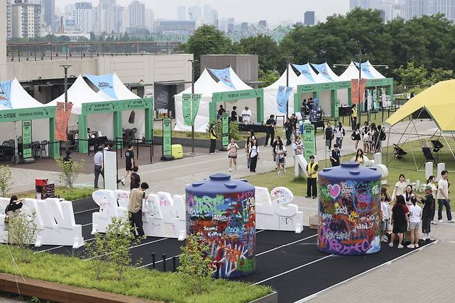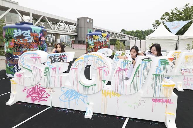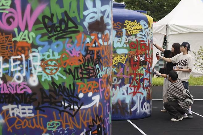13일 서울 용산구 노들섬에서 열린 서울썸머바이브 행사에서 시민들이 그라피티 체험을 즐기고 있다.
