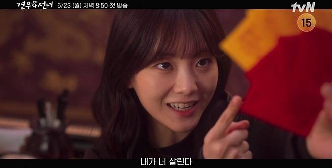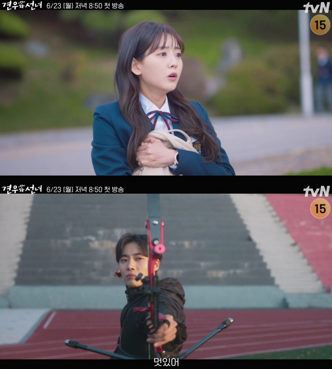이날 공개된 메인 예고는 과녁을 향해 활시위를 당기는 배견우에게 제대로 심쿵한 박성아의 모습으로 시작한다. "거꾸로 걸어 다니는 사람은 액운 끼어서 곧 죽을 사람이야"라는 천지선녀 박성아의 말이 떨어지기 무섭게 법당으로 거꾸로 걸어 들어온 배견우. 첫사랑의 불길한 미래를 내다본 박성아는 배견우 살리기에 돌입한다. 액운을 부르는 배견우의 남은 수명은 겨우 삼칠일(21일). "내가 너 살린다"라는 박성아의 각오가 비장하다.