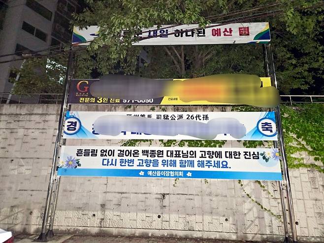 이런 가운데, 예산읍 이장협의회는 지난 12일 오후 예산읍 전역에 10개의 현수막을 달았다. 현수막에는 '흔들림없이 걸어온 백종원 대표님의 고향에 대한 짐심-다시 한번 고향을 위해 함께 해 주세요', '원도심 발전을 위한 –진심어린 예산사랑 백종원 대표님 지지합니다' 등의 내용이 담겼다.