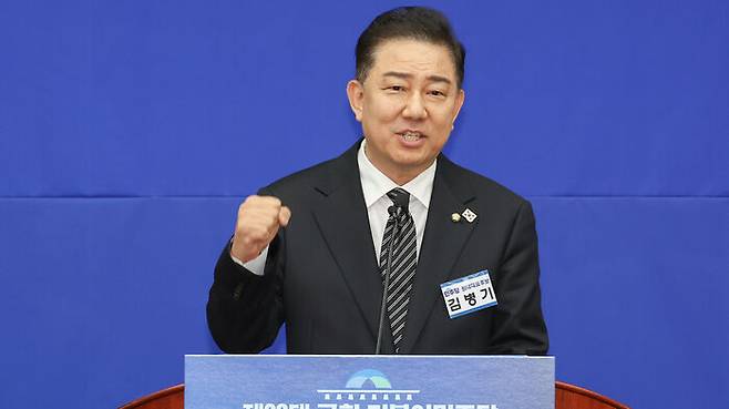 ▲ 더불어민주당 원내대표 경선에 출마한 김병기 의원이 13일 서울 여의도 국회에서 열린 원내대표 선출 의원총회에서 정견 발표를 하고 있다.