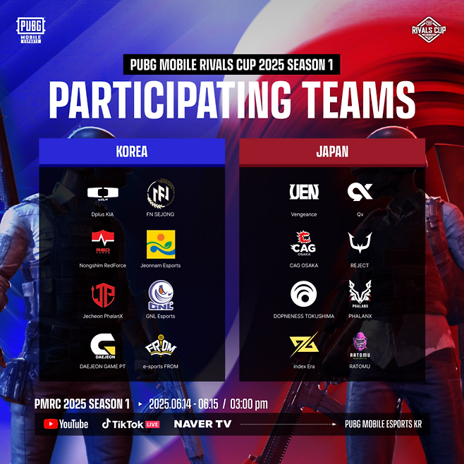 13일, 크래프톤은 '배틀그라운드 모바일 라이벌스 컵 2025 시즌 1: 한국 vs 일본(PUBG MOBILE RIVALS CUP 2025 SEASON 1: KOREA vs JAPAN, 이하 PMRC 2025 시즌 1)'을 오는 14일부터 15일까지 양일간 개최한다고 밝혔다.