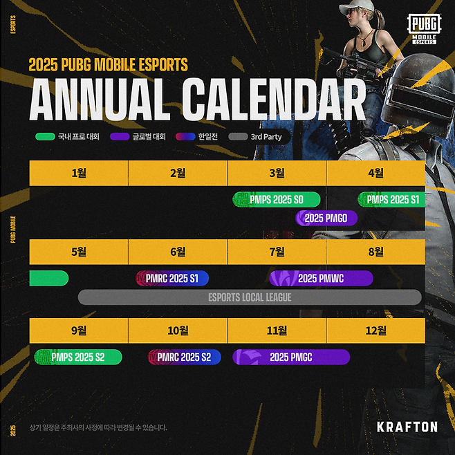 크래프톤은 PMRC 개최와 함께 2025년 PUBG 모바일 e스포츠 연간 로드맵도 공개했다. 올해는 정규 시즌(PMPS 시즌 0, 1, 2), 지역 기반의 신규 리그, PMRC, 월드컵(PMWC), 글로벌 챔피언십(PMGC) 등으로 구성된다.