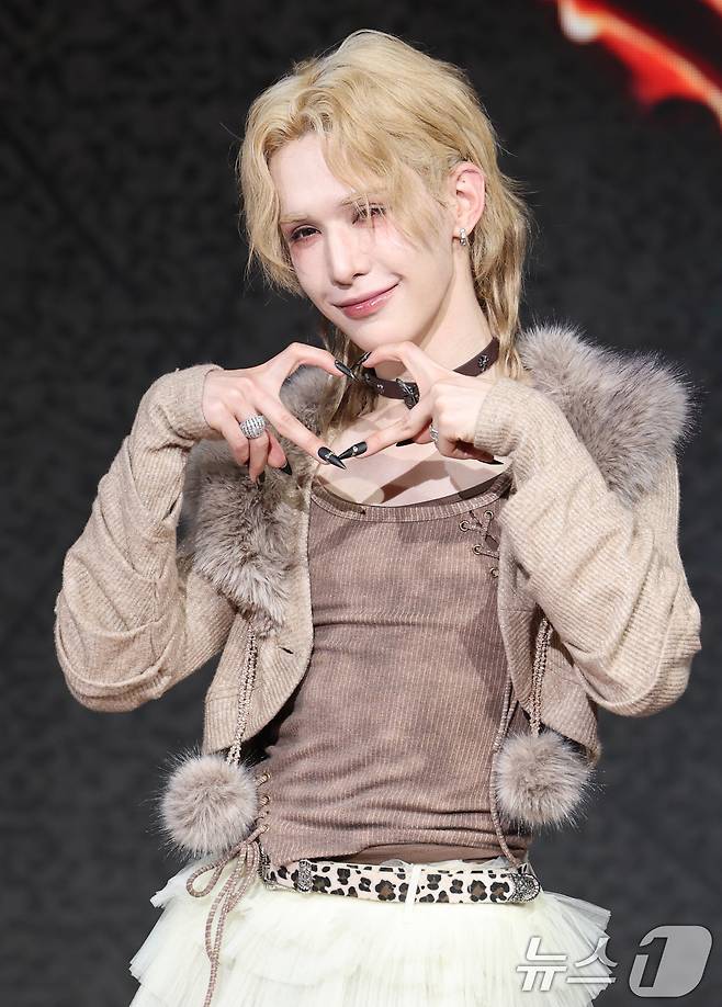 (서울=뉴스1) 권현진 기자 = 그룹 엑스러브(XLOVE)의 우무티가 13일 서울 마포구 쇼킹케이팝센터에서 진행된 두 번째 싱글 앨범 'I ONE(아이 원)' 발매 쇼케이스에서 포즈를 취하고 있다. 2025.6.13/뉴스1