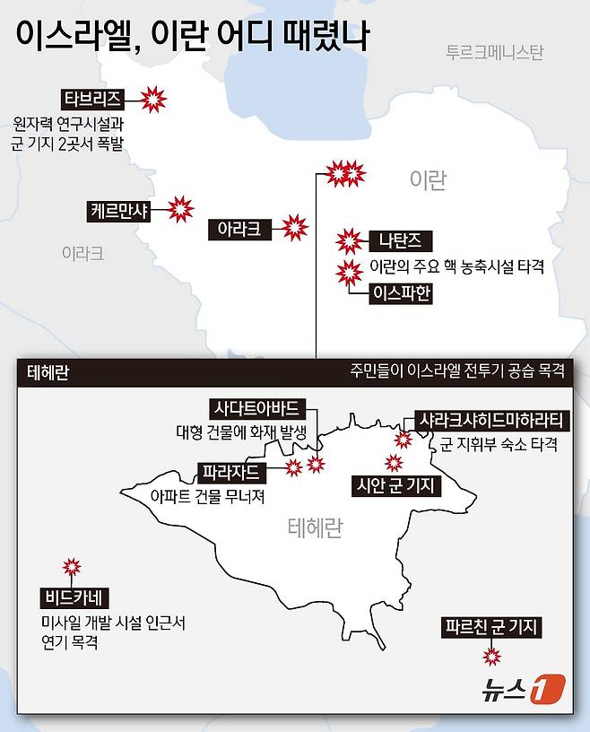 (서울=뉴스1) 강민경 이창규 기자 최종일 선임기자 = 이스라엘이 13일(현지시간) 새벽, 이란의 핵 프로그램 및 군 시설을 "선제 타격"했다고 밝혔다. '일어서는 사자' 작전에 이란의 최고 사령과 3명과 과학자들이 사망하고 핵 시설이 파괴되면서 이란 최고 지도자는 혹독한 응징을 예고했다. 중무장한 라이벌 국가 간 오랜 긴장이 역내 전면전 양상으로 폭발할 수 있다는 우려가 높아지고 있다.