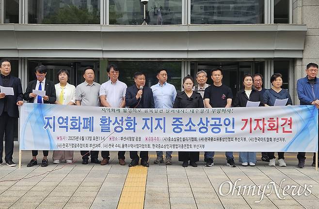 13일 부산시청 광장을 찾은 중소상공인살리기협회, 전국중소유통상인협회 부산지부, 한국마트협회 부산지부, 전국가맹점주협의회 부산지부, 전국수리·용역수탁사업자협의회 등 6개 단체는 합동 기자회견에서 "지난 정부에서 축소됐던 지역화폐 정책이 대폭 확대돼야 한다"라며 적극적인 지원을 요청했다.