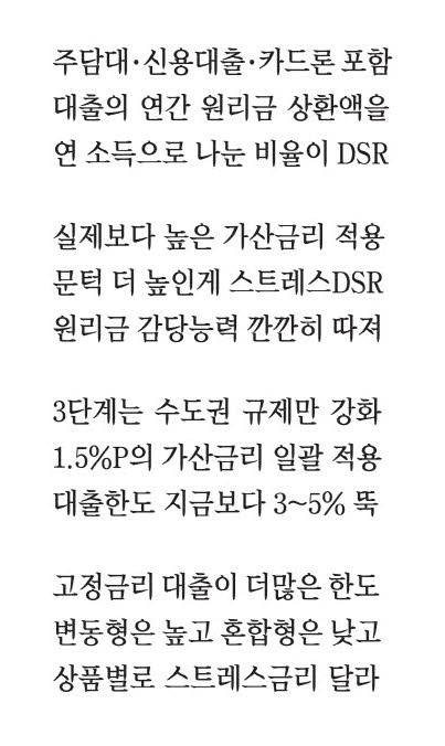 스트레스 DSR은 실제 금리에 일정 수준의 가산금리를 더해 DSR을 계산해 대출 문턱을 높이는 제도다. 실제 금리보다 높은 가산금리로 DSR을 산정하기 때문에 이자 부담은 커지고, 동일한 DSR을 유지하기 위해 대출 규모는 줄어든다. 향후 금리가 올라가 원리금 상환 부담이 커졌을 때도 차주가 이를 감당할 수 있을지 미리 보다 엄격하게 평가하기 위함이다.
