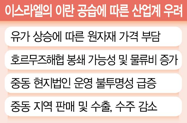 이스라엘의 이란 폭격으로 중동 지역 위기감이 고조되면서 국내 정유·석유화학·해운 업계는 유가 급등과 호르무즈해협 봉쇄 등에 대비한 대책 수립에 나섰다. 현지 해외 법인을 둔 전자·자동차 등 업계는 전쟁 확산 가능성을 염두에 두고 상황을 예의 주시하고 있다.