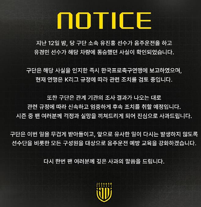 전남도 SNS를 통해 사과문을 발표했다. 구단은 '지난 12일 밤, 유진홍이 음주운전을 하고 유경민이 해당 차량에 동승했던 사실이 확인됐다. 해당 사실을 인지한 즉시 한국프로축구연맹에 보고했다. 현재 연맹은 K리그 규정에 따라 관련 조치를 검토 중이다'고 밝혔다.