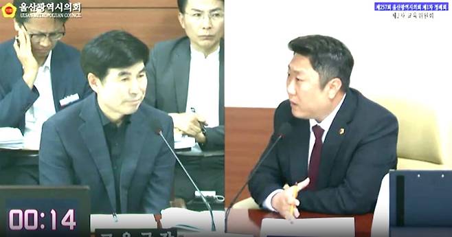 | ▲ 국민의힘 김종섭 울산시의원(오른쪽)이 6월 11일 울산시의회 교육위원회에서 한상철 울산교육청 교육국장에게 질의하고 있다 |