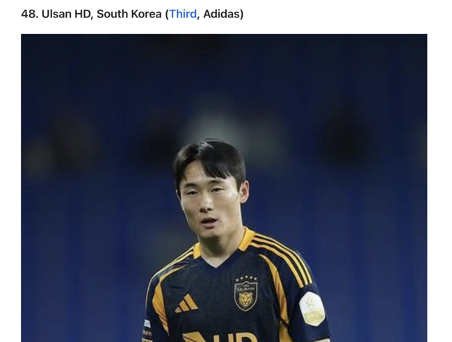 그나마 울산의 검은색 서드유니폼은 48위를 차지해 체면을 세웠다. ESPN은 “스폐셜로 제작된 울산의 세 번째 유니폼은 남색에 골드로 줄무늬를 넣었다. 원자핵을 연상시키는 패턴으로 울산의 전력산업을 의미한다. 2023년 구단의 브랜드데이에 런칭했다. 울산의 모기업은 중공업을 위주로한 한국의 대기업”이라 소개했다.