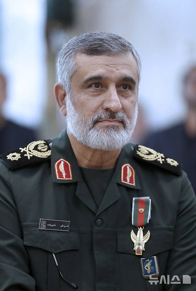 [테헤란(이란)=AP/뉴시스]아미르 알리 하지자데 이란 혁명수비대 항공우주사령관이 2024년 10월6일 테헤란에서 열린 기념식에서 아야톨라 알리 하메네이 최고지도자로부터 훈장을 받은 뒤 앉아 있다. 이스라엘은 이란 혁명수비대의 미사일 프로그램 책임자 알리 하지자데 장군이 이스라엘군의 공습으로 사망했다고 13일 주장했지만 이란은 이를 인정하지 않고 있다. 2025.06.13.