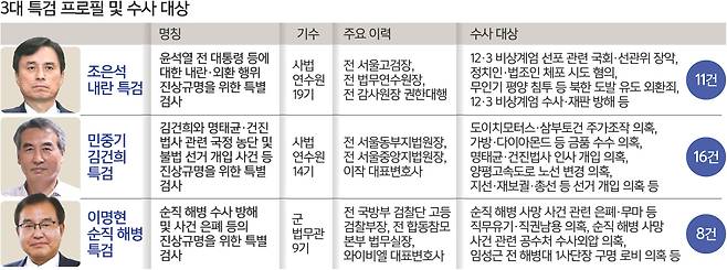 임명에 앞서 여러 하마평이 나왔으나 최종적으로 검찰 특수통 출신으로 감사 업무까지 경험한 수사·감사 전문가인 조 특검과 ‘사법부 블랙리스트’ 의혹 진상조사를 지휘한 민 특검이 임명됐다. 또 군법무관 출신으로 과거 병역비리 등 군 사건에 정통하고 순직해병 수사 전반에도 이해가 깊은 이 특검이 낙점됐다. 이들은 큰 조직을 이끌어 봤고 대형 사안을 다뤄봤던 경험이 있는 검증된 인사라는 공통점이 있다.