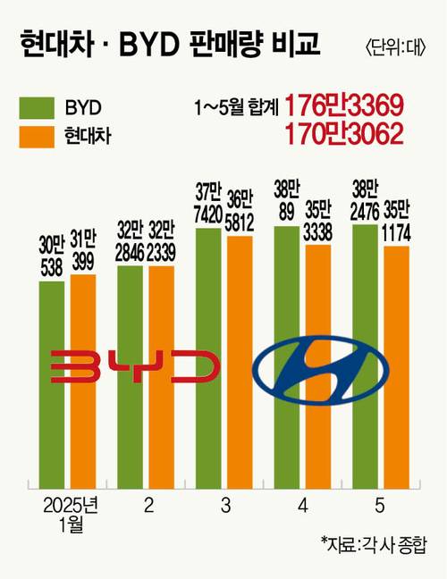 BYD는 지난해 427만대를 판매해 창사 이래 처음으로 현대차 판매량 414만대를 앞질렀다. 올해 들어 현대차가 판매 호조를 보이며 지난 2월까지는 BYD에 앞섰지만 3월부터는 다시 BYD에 추월당했다. 특히 BYD 판매량이 급증하면서 현대차와 격차는 더 벌어질 전망이다.