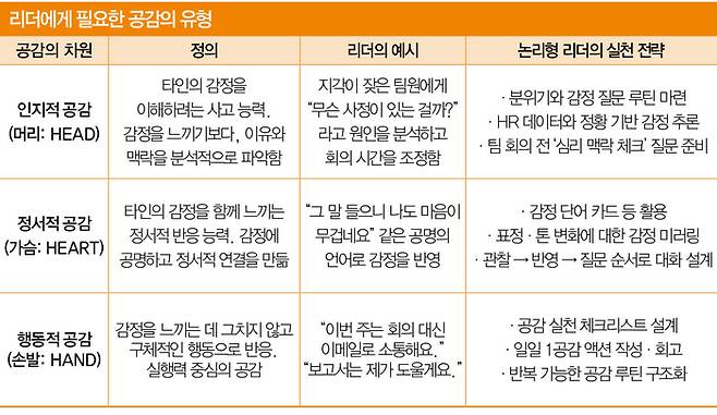 김 코치: 공감은 타고나는 성향만은 아니다. 공감의 3가지 종류를 이해하면 보다 더 자신감을 가질 수 있다. 공감에는 3H, 즉 가슴(Heart)의 공감 외에 머리(Head)의 인지적 공감, 손발( Hand)의 실행이 있다. 머리로 이해하고, 가슴으로 연결하고, 손발로 실천하는 기술의 조합이다. 논리형 리더는 이 세 요소 중 인지와 행동에서 이미 강점을 가지고 있다. 정서적 공감은 ‘표현 학습’을 통해 충분히 보완할 수 있다. 베이조스처럼 똑똑함에서 따뜻함으로 건너가려면, 정답을 찾기보다 맥락을 읽는 연습이 필요하다.