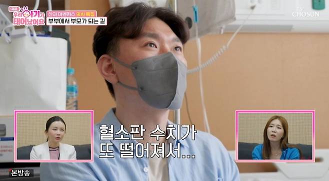 이를 듣던 산모의 남편은 눈시울을 붉혔다. 그는 "오늘 아침에 수치가 떨어졌다고 해서 엄청 울었다"라고 털어놨다. 이들 부부는 시험관 4번과 자궁외 임신 등의 우여곡절 끝에 어렵게 임신에 성공했다.