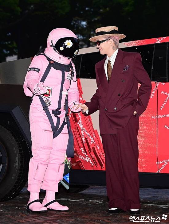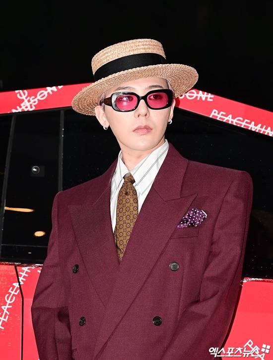 이 자리에서 지드래곤은 밀짚모자에 버건디 슈트로 패션 센스를 뽐냈다.
