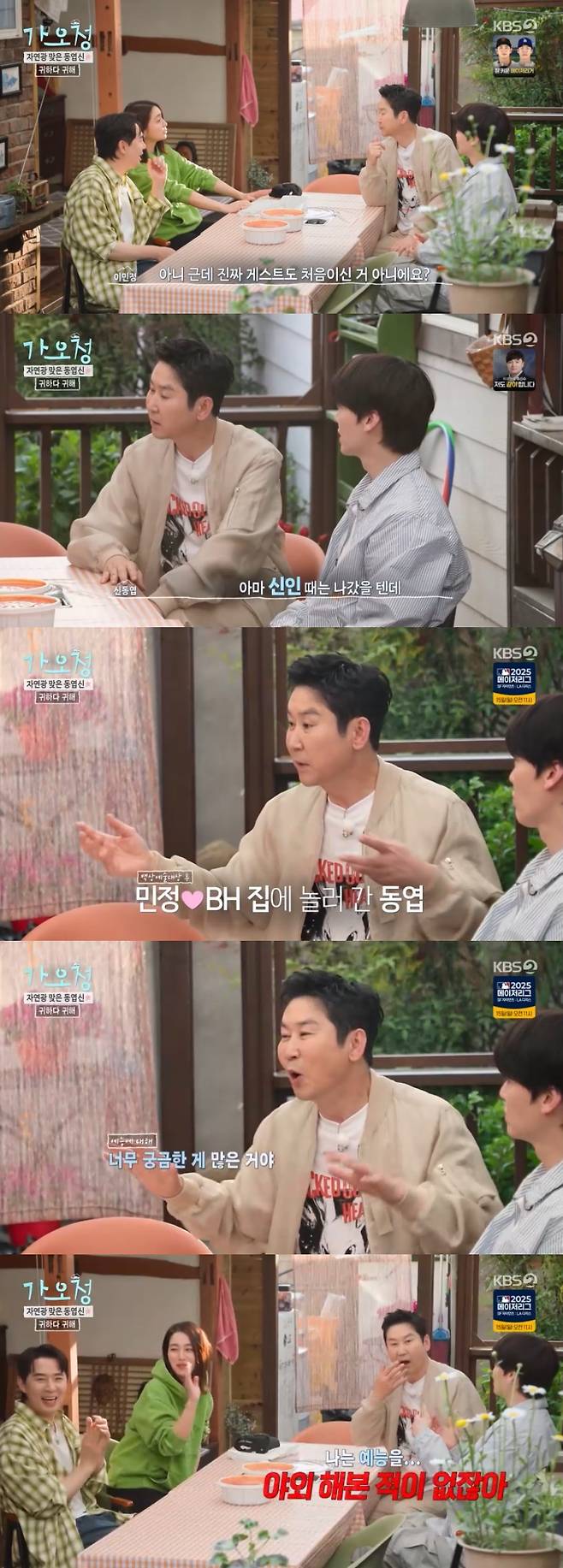 신동엽은 "지난번에 백상 끝나고 병헌이가 집에서 한잔하자고 불렀다. 민정 씨가 아기 재우고 합류하면서 너무 궁금한 게 많은거다. 예능 프로그램에 대해서. 이것저것 물어보는데 나는 예능을 야외를 해본적이 한 번도 없다"라고 털어놔 모두를 폭소케 했다.
