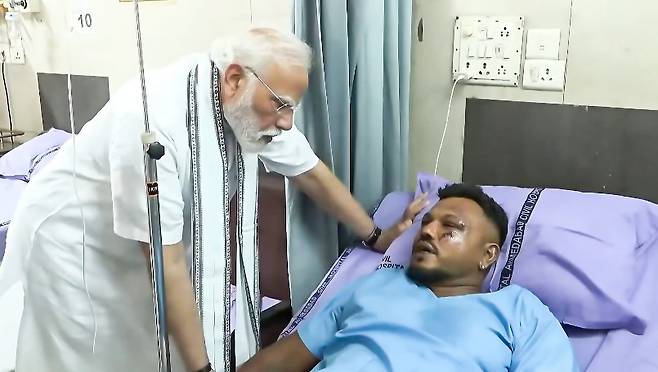 | 모디 총리, 유일하게 살아남은 영국인 생존자 병원 찾아가 13일(현지 시간) 나렌드라 모디 인도 총리(왼쪽)가 인도 서부 구자라트주 아마다바드의 병원을 찾아가 전날 에어인디아 항공기 추락 사고에서 유일하게 살아남은 영국인 생존자를 살펴보고 있다. 아마다바드=신화 뉴시스 |