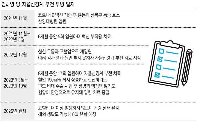 고졸 검정고시에 합격한 하영 양은 간호학을 공부하기 위해 올 8월 미국 대학에 진학한다. 투병 과정에서 간호사의 길을 걷기로 결심했단다. 그는 “간호사 선생님들의 응원과 따뜻한 격려를 정말 많이 받았다. 나도 나중에는 아픈 사람들에게 따뜻함을 전하고 싶다”고 말했다. 유학 중에 문제는 생기지 않을까. 나 교수는 “청소년기에 자율신경계 부전은 1∼2년 동안 몰아서 집중적으로 나타난다. 이미 1년 넘게 안정된 상태를 유지하고 있어 걱정하지 않아도 될 것 같다”고 진단했다.