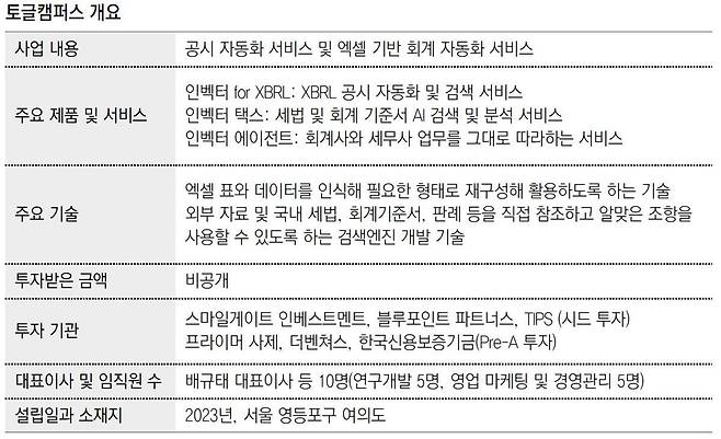 토글캠퍼스는 엑셀 자료를 사람처럼 인식하는 인공지능(AI)을 개발해 XBRL 공시를 자동화하는 솔루션을 만들었다. 10일 서울 영등포구 여의도 본사에서 만난 배규태 대표이사는 “내로라하는 대기업들이 회계사에게 맡겨도 30% 가까이 오류가 발생할 만큼 복잡하고 고된 일”이라며 “1명이 몇 개월 걸릴 작업량을 1주일 이내 끝낼 수 있게 만들었다”고 자신했다.