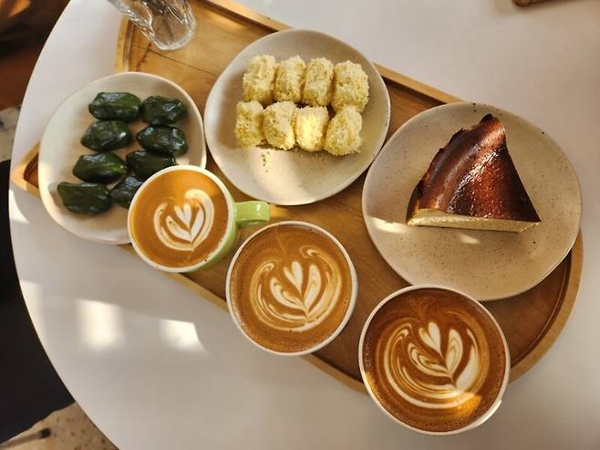 부모님은 ‘온수 제분소’, 아들은 바로 옆에서 ‘카페 곧은’을 운영한다. 떡 방앗간에서 만든 아빠표 카스텔라 인절미는 아들표 커피와 참 잘 어울린다. (인천 강화군 길상면 전등사로 80 1층/카스텔라인절미 4천원, 쑥개떡 4천원)
