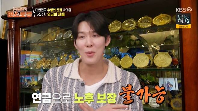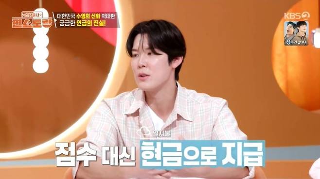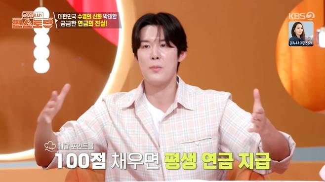박태환은 연금에 대해 "연금으로 평생 먹고사는 건 불가능하다"라고 말문을 열었다. 박태환은 "100점을 쌓아야 연금이 등록된다. 2006년 도하 아시안게임이 첫 대회였는데, 거기서 100점을 다 쌓았다. 그 금액이 소금빵처럼 짭짤하다"라고 밝혔다.