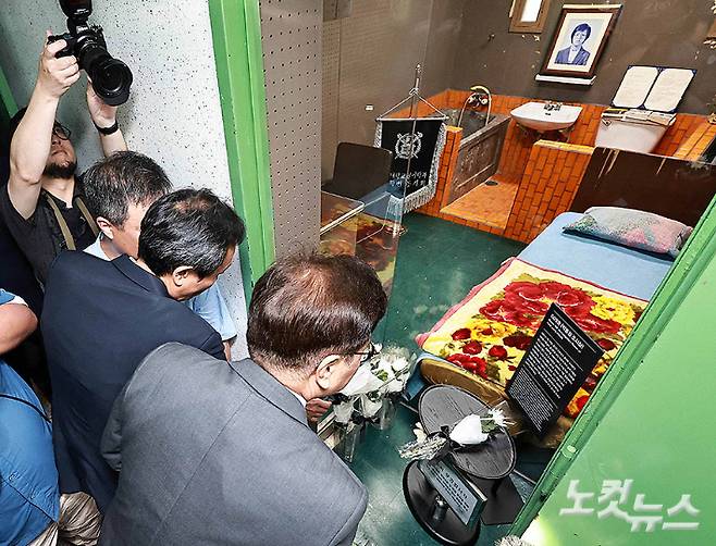10일 서울 용산구 민주화운동기념관에서 열린 제38주년 6·10민주항쟁 기념식을 마친 우원식 국회의장, 우상호 대통령실 정무수석, 이재오 민주화운동기념사업회 이사장이 대공분실 509호 박종철 조사실을 찾아 헌화하고 있다. 박종민 기자