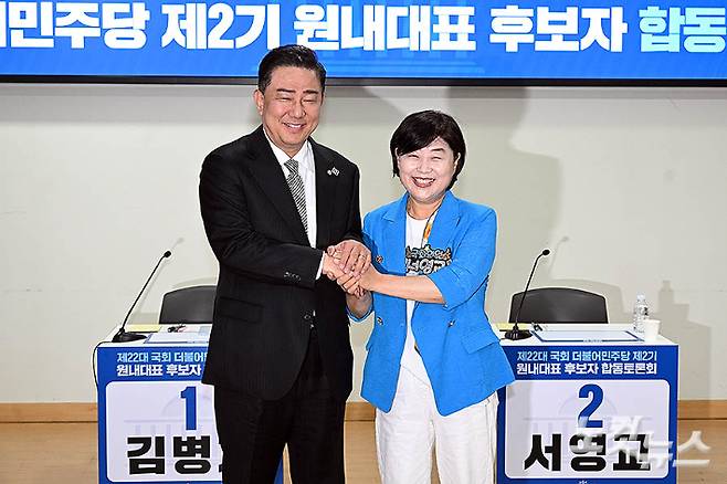 10일 국회 의원회관에서 열린 제22대 국회 더불어민주당 제2기 원내대표 후보자 합동토론회에서 김병기(왼쪽), 서영교 후보자가 토론회에 앞서 기념촬영을 하고 있다. 윤창원 기자