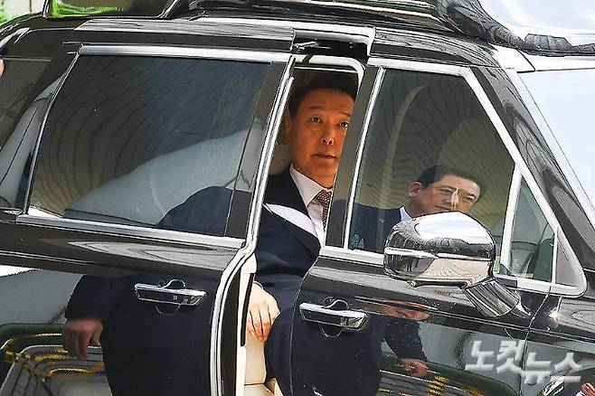 윤석열 전 대통령이 9일 서울 서초구 중앙지방법원에서 열린 내란 우두머리 협의·직권남용 권리행사 방해 혐의 사건 6차 공판에 출석하고 있다. 경찰은 윤 전 대통령에게 이달 12일 출석하라고 소환 통보한 가운데, 윤 전 대통령 측은 서면으로도 조사가 가능하다며 사실상 출석 의사가 없음을 시사했다. 사진공동취재단