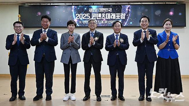 12일 오후 서울 여의도 국회 의원회관에서 열린 2025 콘텐츠미래포럼 'K-콘텐츠와 스포츠 미디어 산업의 미래'에서 참석자들이 기념촬영을 하고 있다. 왼쪽부터 정상원 문화체육관광부 콘텐츠정책국장, 더불어민주당 이기헌 의원, 한국마사회 탁구단 현정화 감독, 나이영 CBS사장, 박상용 CBS M&C 대표, 더불어민주당 박수현 의원, 임오경 의원. 류영주 기자