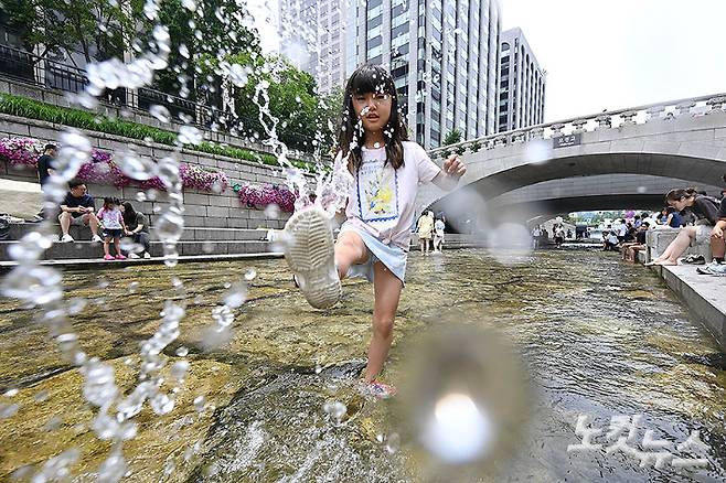 초여름 더위가 이어지고 있는 13일 서울 서울 종로구 청계천 일대에서 어린이가 물놀이를 하고 있다. 서울시는 청계천 복원 20주년을 맞아 22일까지 청계폭포부터 모전교까지 이어지는 청계천 상류 구간에서 시민 물놀이 공간을 개방하는 '청계천 물 첨벙첨벙' 행사를 진행한다. 류영주 기자