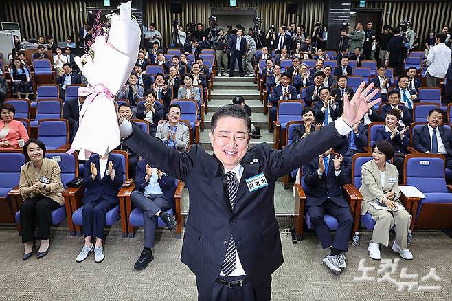 더불어민주당 김병기 신임 원내대표가 13일 국회에서 열린 제22대 국회 더불어민주당 제2기 원내대표 선출 의원총회에서 꽃다발을 들고 기념촬영하고 있다. 윤창원 기자