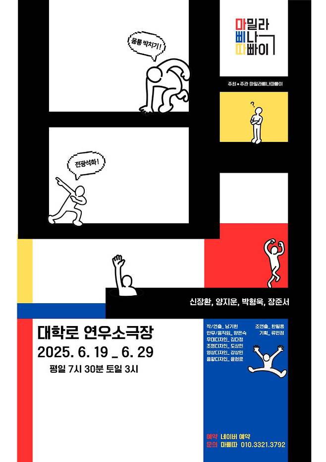 ‘마음껏 삐딱하게, 따뜻하게’라는 슬로건으로 창단한 극단 마밀라삐나따빠이(마삐따)의 첫 부조리극이다. 몸통 박치기를 반복하는 리아, 전광석화를 외치는 장벽 두 인물을 통해 ‘불통’으로 대표되는 동시대 사회의 부조리를 그려낸다. 극단 대표 남기헌이 극작과 연출을 맡고 배우 양지운, 신장환, 박형욱, 장준서 등이 출연한다.
