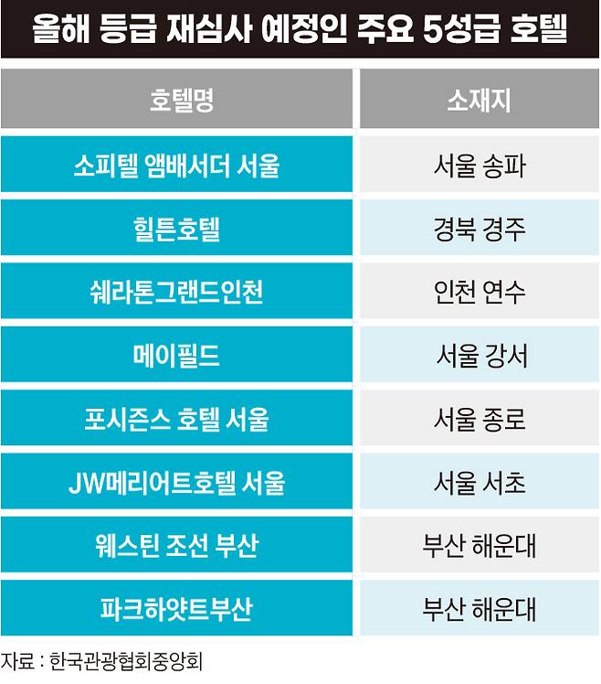 올해도 ‘웨스틴 조선 부산’, ‘JW메리어트서울’, ‘포시즌스 호텔 서울’ 등 국내 유명 5성급 호텔들이 등급 재심사를 앞두고 있는 상황이다.