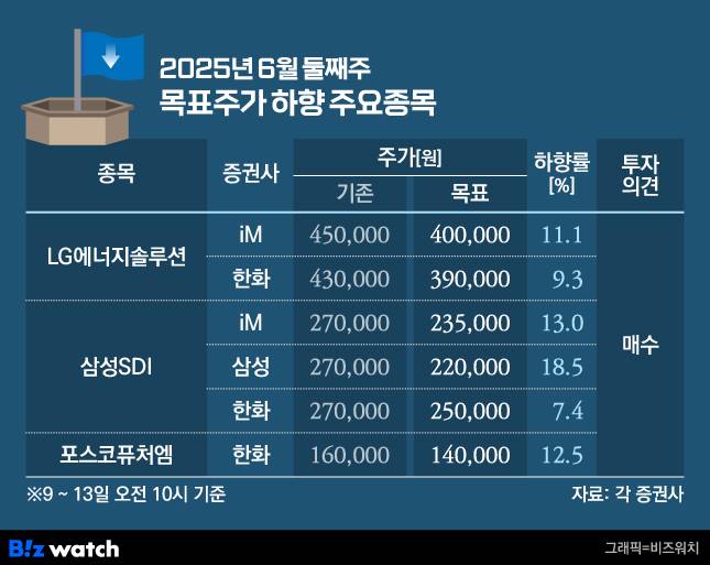삼성SDI에 대해서도 목표가 하향이 이어졌다. 정원석 iM증권 연구원은 "삼성SDI의 올해 1분기 매출액은 3조5000억원, 영업적자 2310억원으로 시장기대치(매출액 3조6000억·영업적자 908억원)를 밑돌 것"이라고 말했다.