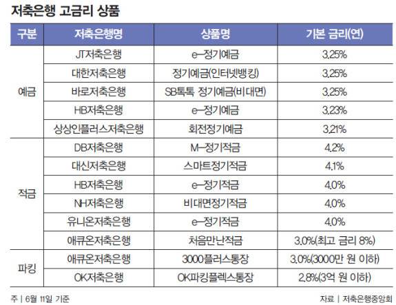 반면 저축은행에선 기본 금리 4%대 적금이 대세다. 현재 가장 높은 금리를 주는 상품은 DB저축은행의 'M-정기적금'이다. 모바일뱅킹 가입 시 기본 이율에 최고 우대금리 0.2%가 자동 적용돼 4.2% 금리가 제공되며 금액 제한이 없다. 대신저축은행의 '스마트정기적금'은 모바일앱 전용 상품으로 별도 우대 조건 없이 4.1% 이자를 지급한다.또 HB저축은행의 'e-정기적금'과 '스마트정기적금', NH저축은행의 '비대면정기적금', 고려저축은행의 '응답하라2030정기적금'과 '정기적금', 대한저축은행의 '정기적금', 세람저축은행의 '비대면 정기적금', 유니온저축은행의 'e-정기적금', MS저축은행의 '정기적금', 참저축은행의 '정기적금', 키움저축은행의 'SB톡톡정기적금(비대면)' 등도 모두 별도 우대 조건이나 금액 제한 없이 4% 금리를 제공한다.