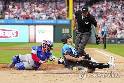 Philadelphia Phillies' Otto Kemp, right, is tagged out at home plate by Toronto Blue Jays' Alejandro Kirk, left, on an RBI double hit by Phillies' Brandon Marsh during the second inning of a baseball game, Friday, June 13, 2025, in Philadelphia. (AP Photo/Derik Hamilton)