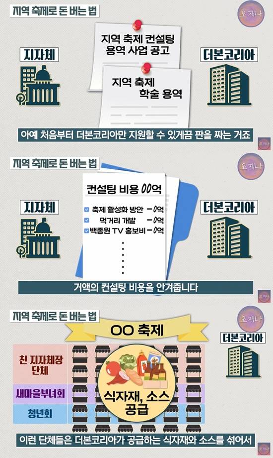 이에 대해 김 PD는 지자체와 더본코리아가 공조하는 방식을 소개했다. 그는 "지자체는 더본코리아 맞춤으로 지역 축제 컨설팅 용역 사업공고를 낸다. 다른 업체들이 지원하지 못하도록 '학술용역'이라는 카테고리로 공고를 내기도 한다. 때문에 더본코리아가 쉽게 낙찰된다"고 폭로했다.