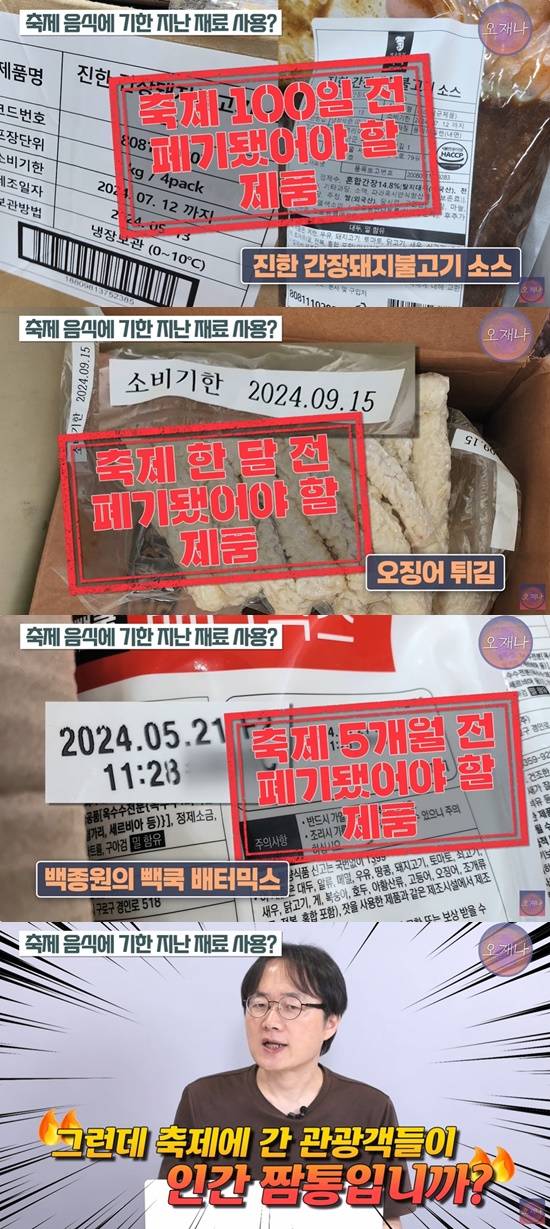 예산 상인 A씨는 "더본코리아와 식자재 창고를 같이 썼다. 유통기한이 지난 식자재 재고가 쑥쑥 줄어들고 있는 것을 사진으로 다 찍어 놨다. 흑백요리사에도 나오시는 분이 유통기한 지난 식자재 재고를 소진하면 어떡하냐. 이건 완전히 잘못된 것"이라고 지적했고, 상인 B씨 또한 "이번에 축제 때 (소비기한 지난 걸) 소진한 걸 저도 알고 있다. 누가 봐도 잘못된 것"이라고 비판했다.
