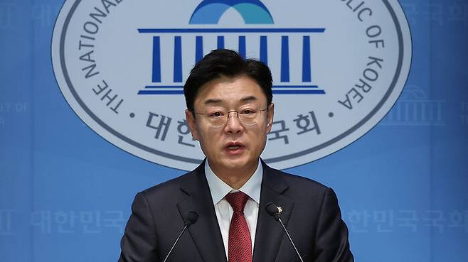 ▲ 국민의힘 김성원 의원이 12일 서울 여의도 국회 소통관에서 원내대표 출마 선언을 하고 있다.