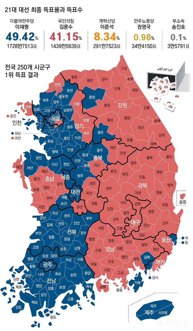 “(나라가) 빨강, 파랑으로 나뉘었다. 통합된 나라로 만들어야 한다.” 이재명 대통령이 7일 여당 지도부와의 만찬에서 6·3 대선 결과를 놓고 말했다고 한다. 전국 250개 시군구 1위 득표 결과를 지도로 보면 나라가 둘로 쪼개진 느낌이긴 하다. 영남과 강원, 충남 일부는 국민의힘의 빨강색이고, 나라의 서쪽은 더불어민주당의 빛깔로 온통 파랗다.