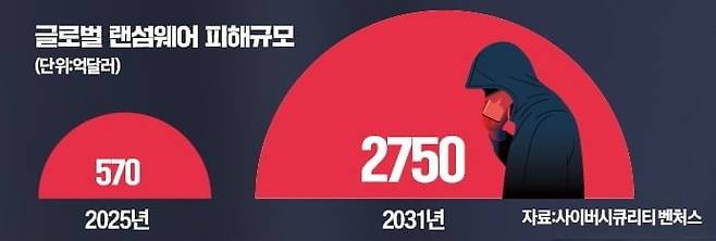 또 다른 보안업체 사이버시큐리티벤처스는 "랜섬웨어 공격은 지구 곳곳에서 2초에 한 번꼴로 발생하고 있다"며 "현존하는 사이버 범죄 가운데 가장 빠르게 성장 중"이라고 설명했다. 세계 랜섬웨어 피해액은 올해 570억달러(약 77조원)에서 2031년 2750억달러(약 373조원)로 늘어날 것으로 전망했다.