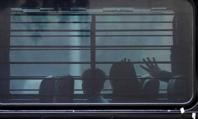 11일(현지시간) 쿠바에서 온 어린 소년과 그의 부모가 미국 샌 안토니오 이민법원에 출석한 뒤 철창이 둘린 버스에 실린 채 창문 밖을 바라보고 있다.