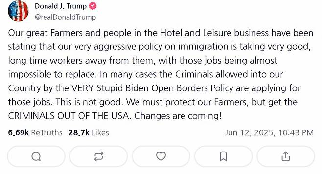 NYT에 따르면 트럼프 대통령은 브룩 롤린스 미국 농무부 장관으로부터 불법 이주민 단속으로 인한 인력난을 우려하는 농가 목소리를 전해듣고 이 글을 올렸다고 한다.