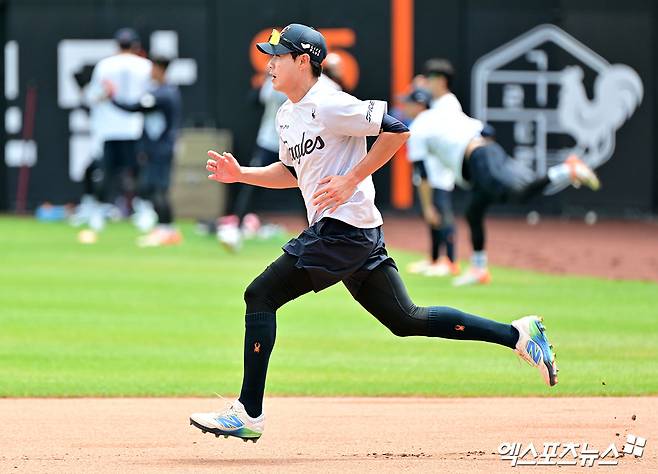 (엑스포츠뉴스 대전, 김한준 기자) 14일 오후 대전 한화생명 볼파크에서 열리는 '2025 신한 SOL Bank KBO리그' LG 트윈스와 한화 이글스의 경기, 한화 심우준이 주루 훈련에 임하고 있다.